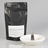 Place incense cone in a cone burner or in a bowl burner on a bed of sand or natural ash with point facing up. Light the tip of the incense cone, once tip glows red, gently extinguish the flame.